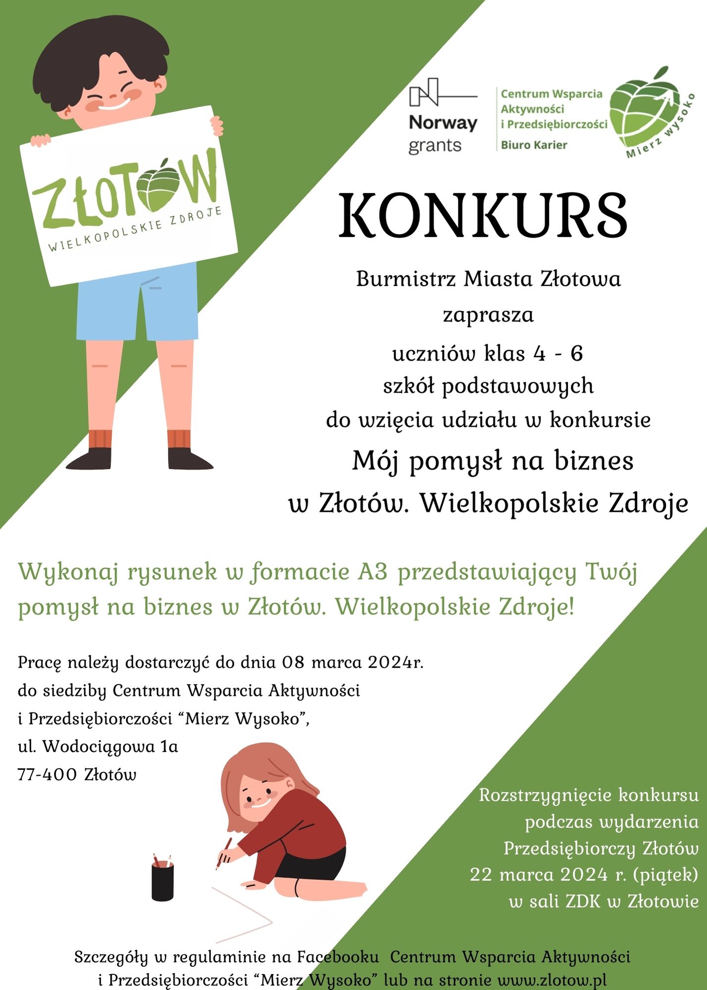 馃枍send by March 8, 2024 to a.tomaszewska@zlotow.pl or bring it directly to the headquarters of the Activity and Entrepreneurship Support Center "Mierz Wysoko", ul. Wodoci膮gowa 1a 馃枍and win a tablet, smartwatch or wireless headphones! 馃帹 details and rules of the competition 馃帹 https://zlotow.pl/Konkurs_Moj_pomysl_na_biznes_w_Zlotow... 鈩癸笍All activities are carried out as part of the project called Z艂ot贸w. Wielkopolskie Zdroje financed by the Norwegian Financial Mechanism and the state budget. #localdevelopment #Norwegianfunds #EEA #norwaygrants #eeagrants #eeanorwaygrants #NorwegianFundsandEEA Z艂ot贸w. Wielkopolskie Zdroje Norwegian and EEA funds Ministry of Funds and Regional Policy