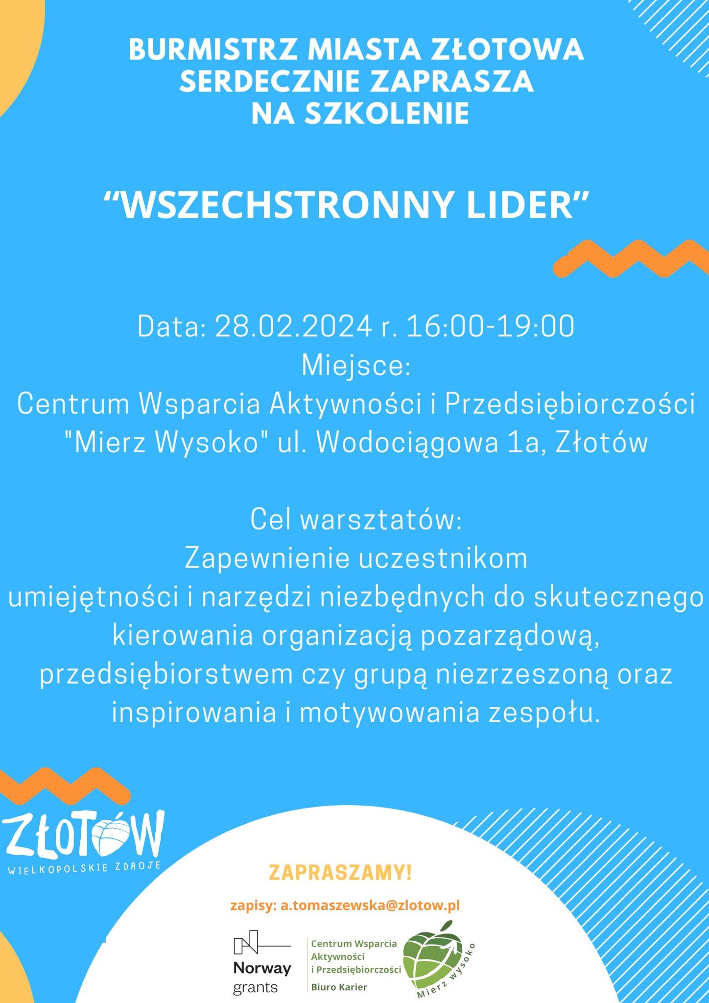 Do you want to learn how to build a good team? How to introduce new ideas and solutions when there is strong opposition from the team? How to have difficult conversations with employees? The Mayor of Złotów invites all those who would like to acquire the knowledge, skills and experience necessary to develop pro-social attitudes to the workshops. The workshops were divided into three meetings, each devoted to a different topic. Places are limited. The workshops will be held on February 28 (Wednesday) at the headquarters of the Activity and Entrepreneurship Support Center "Mierz Wysoko", ul. Wodociągowa 1a. 16:00-19:00 Registration: 786-441-945 a.tomaszewska@zlotow.pl All activities are carried out as part of the project called Złotów. Wielkopolskie Zdroje financed by the Norwegian Financial Mechanism and the state budget. Złotów. Wielkopolskie Zdroje Ministry of Funds and Regional Policy Norwegian and EEA funds