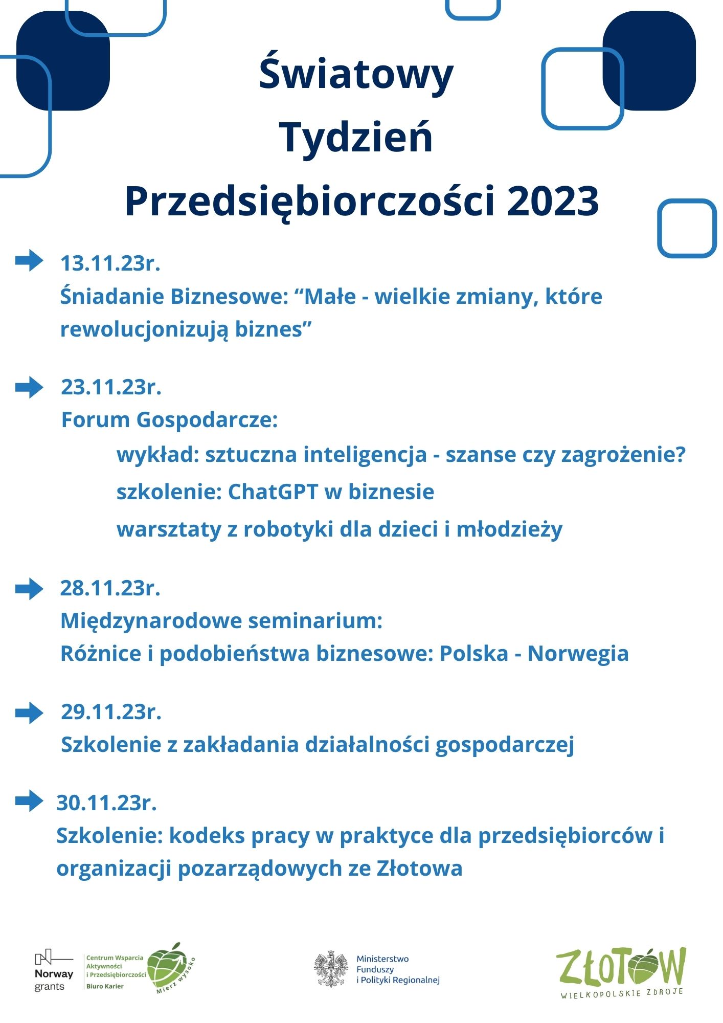 WORLD ENTREPRENEURSHIP WEEK 2023 IN ZŁOTÓW ....will last over two weeks The Mayor of Złotów, Adam Pulit, invites you to a number of events related to entrepreneurship! The first event is the Business Breakfast on November 13, 2023. Next, there will be the Economic Forum, which will be entirely devoted to the topic of the technological revolution During the stay of the delegation from Elverum, we organize an international seminar on business differences and similarities. And we will end with classic training There's plenty to choose from! Which event are you planning to attend? Let me know in the comments All activities are carried out as part of the project called Złotów. Wielkopolskie Zdroje financed by the Norwegian Financial Mechanism and the state budget. #localdevelopment #Norwegianfunds #EEA #norwaygrants #eeagrants #eeanorwaygrants #NorwegianFundsandEEA Złotów. Wielkopolskie Zdroje Norwegian and EEA funds